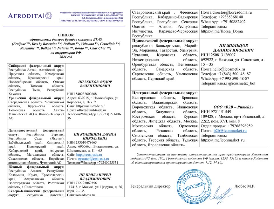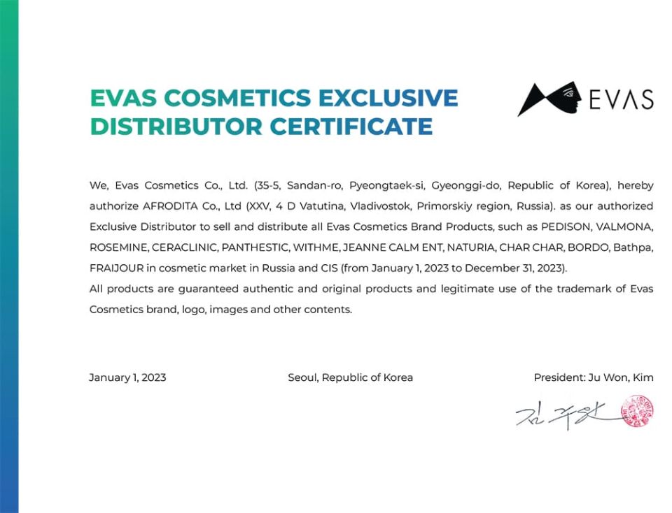 Наша компания имеет все необходимые сертификаты от заводов и клинических центров, подтверждающие нашу компетентность в области дистрибуции косметической продукции. Мы гарантируем, что вся продукция соответствует международным стандартам качества и безопасности.