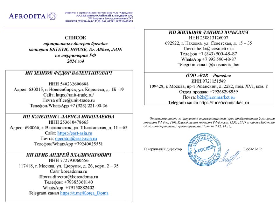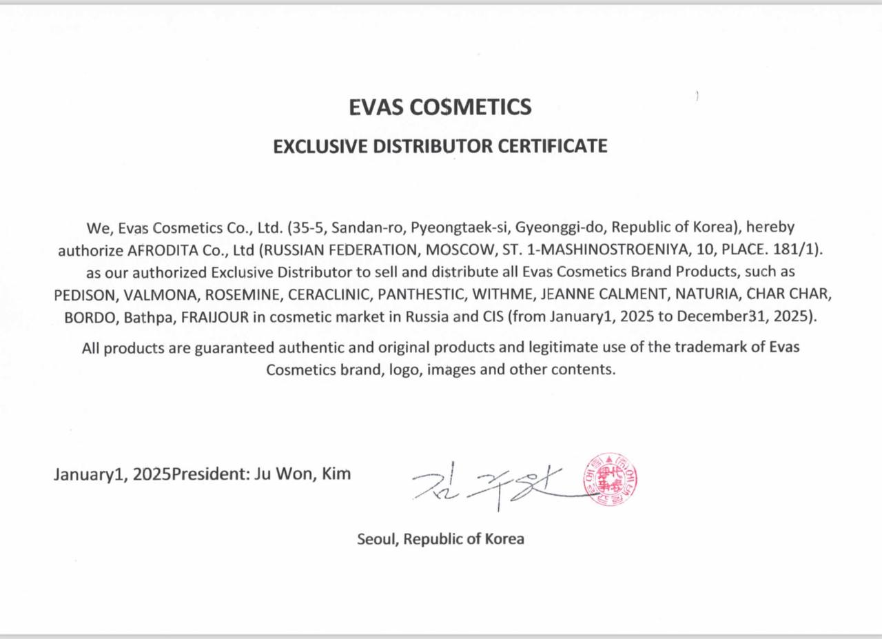 Наша компания имеет все необходимые сертификаты от заводов и клинических центров, подтверждающие нашу компетентность в области дистрибуции косметической продукции. Мы гарантируем, что вся продукция соответствует международным стандартам качества и безопасности.